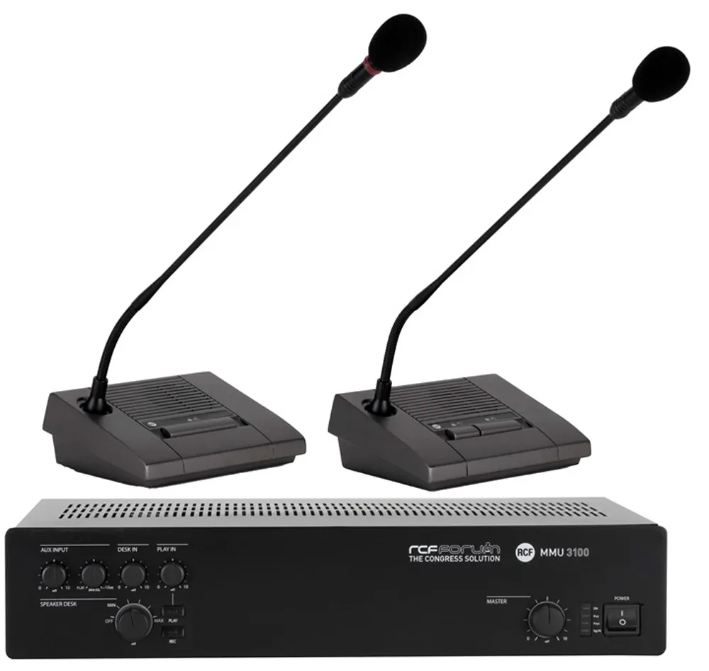 Микрофонный пульт председателя RCF MMS 3405P — часть бюджетной конференц-системы Forum 3000. Оснащён кардиоидным микрофоном PRO-качества на «гусиной шее» длиной 46 см. Имеет кнопки push-lock и push-to-talk, светодиодный индикатор. Терминал RJ-45 для подключения к центральному блоку MMU 3100 через кабель CAT5 FTP. Экранированный корпус для настольной установки.