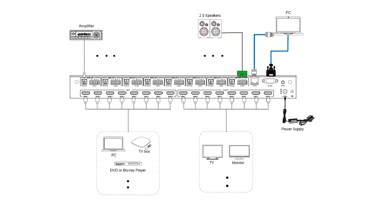 Описание матричного коммутатора Prestel FMS-88H2AMPrestel FMS-88H2AM — это матричный коммутатор HDMI 8x8 для передачи видео с 8 источников на 8 дисплеев HDTV. Поддерживает разрешение до 4K@60 Гц 4:4:4, пропускную способность 18 Гбит/с и функцию видеостены.