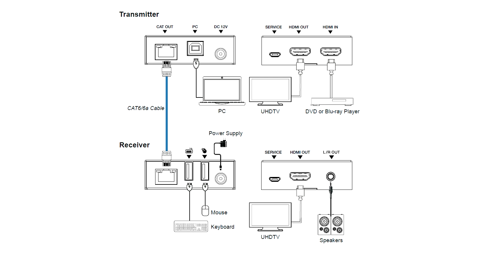 - Длина входного кабеля: 4K2K при 60 Гц 4:4:4 — 70 м, 1080P — 70 м (кабель CAT6)