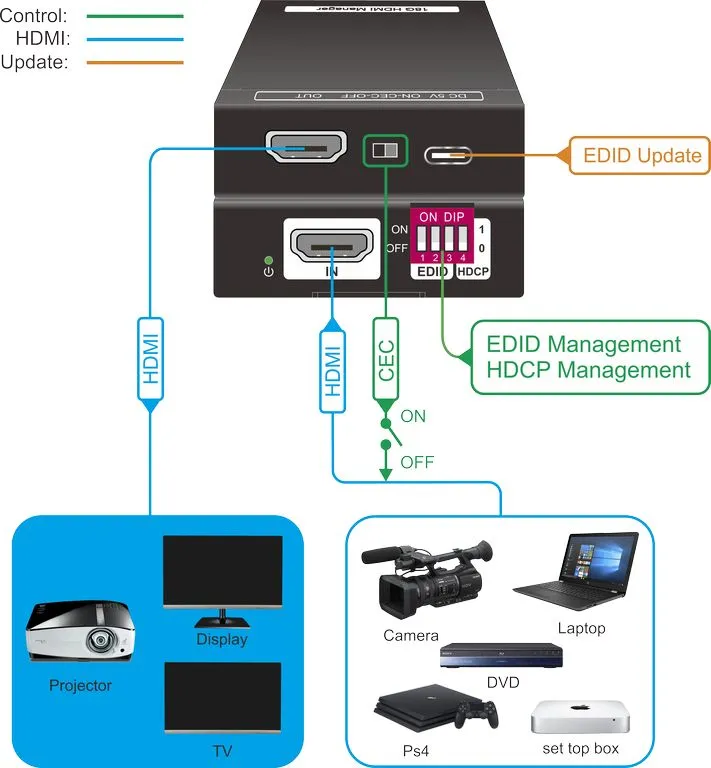 Конвертер Digis EX-HDCP позволяет настроить максимальную совместимость источника сигнала и панели. Конвертер EDID и менеджер HDCP. Поддержка 4K 60Hz 4:4:4 (18 Гб/с), HDMI 2.0, HDCP2.2, CEC. Масштабирование, питание от USB-C и HDMI.| x1 HDMI (ver. 2.0) |