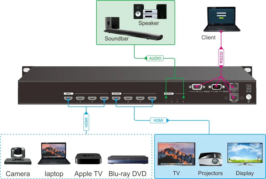 4x4 Digis — устройство с поддержкой 4K, частотой 30 Гц и цветовым форматом 4:4:4. Есть HDMI 1.4, четыре де-эмбеддера, HDCP 1.3, RS232 и возможность управления с пульта. Поддерживает TCP/IP с графическим интерфейсом.
