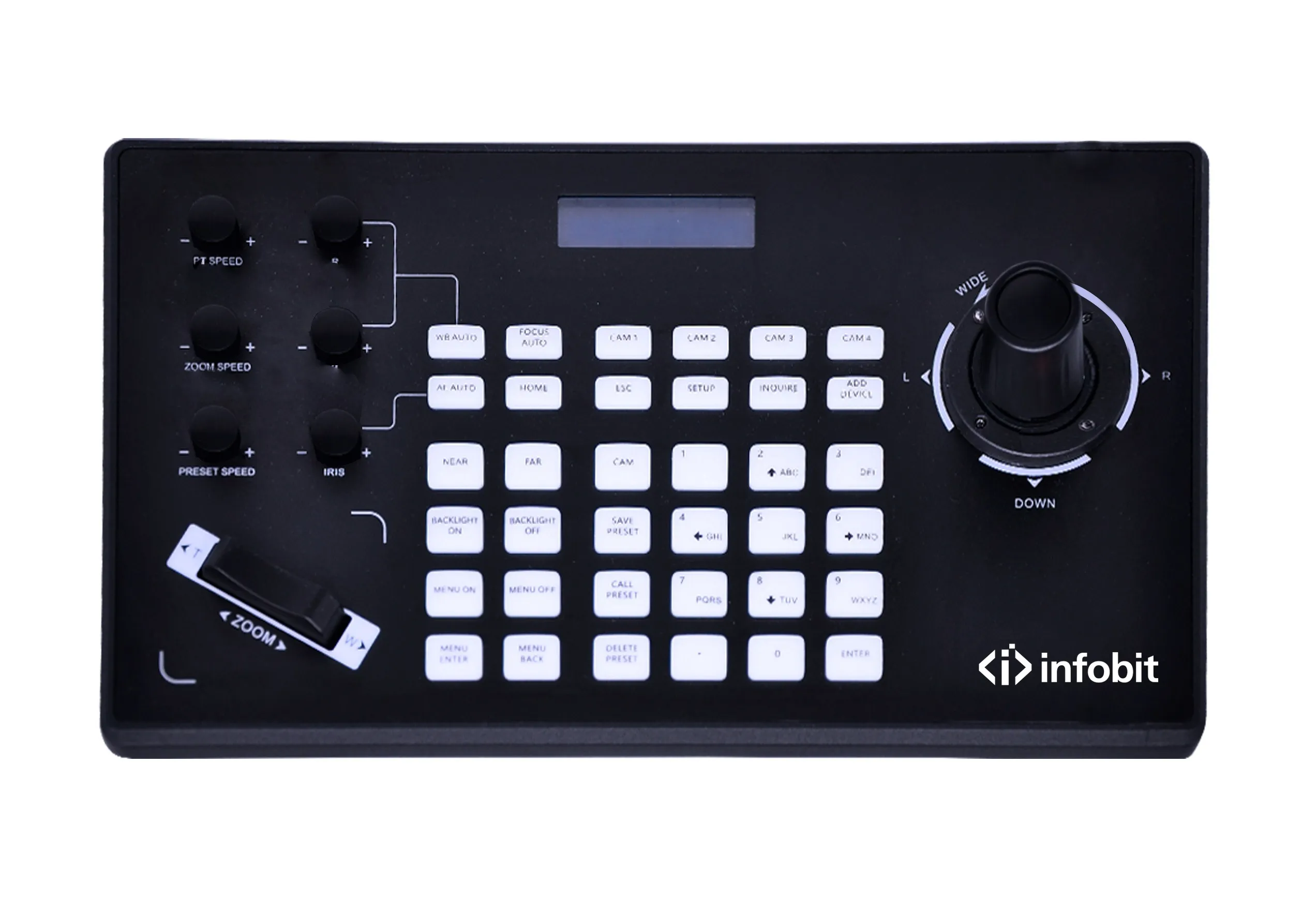 Пульт управления PTZ Infobit iControl J10 — это универсальный контроллер с джойстиком для PTZ-камер, совместимых с VISCA / PELCO. Просто подключите камеру с помощью кабеля DB9 к разъёму mini-din.