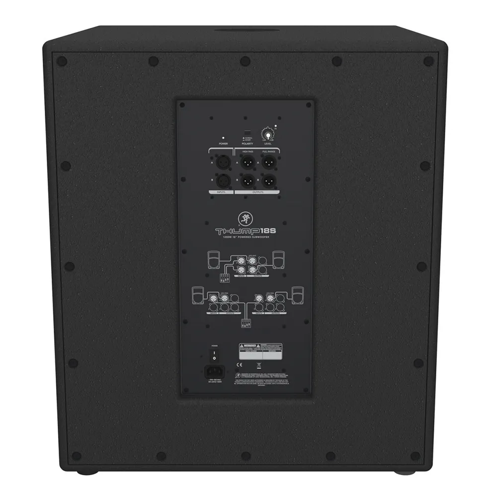 Сабвуфер Mackie Thump18SАктивный сабвуфер Mackie Thump18S с мощностью 1200 Вт (600 Вт RMS) и динамиком 18 дюймов. Обладает частотным диапазоном от 40 Гц до 120 Гц (-3 дБ) и максимальным пиковым SPL 130 дБ. Оснащён кроссовером на 140 Гц и системой охлаждения посредством конвекции. Класс дизайна — D, вход типа Female XLR сбалансированный. Подходит для использования в театрах, церквях, клубах, барах, ресторанах, фитнес-центрах, на живых концертах и в арт-пространствах.