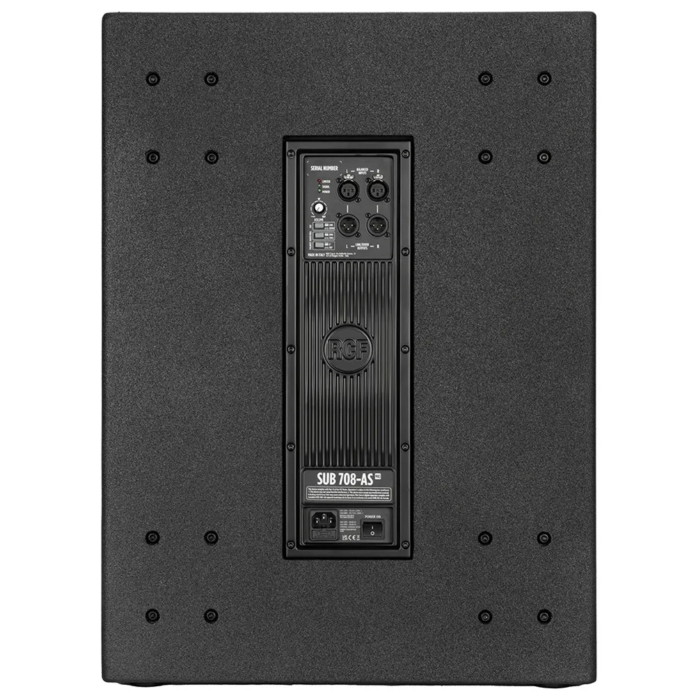 Активный сабвуфер RCF SUB 708-AS MK3RCF SUB 708-AS MK3 — мощный активный сабвуфер для живых выступлений. Оснащён 18-дюймовым НЧ-динамиком и усилителем D-класса мощностью 700 Вт, обеспечивающим уровень звукового давления до 133 дБ. Идеальное дополнение к акустическим системам 12" или 15". Имеет регуляторы громкости, эквалайзера, полярности, задержки и выбора частоты кроссовера на задней панели. Прочный цельнодеревянный корпус с полимочевинным покрытием обеспечивает долговечность и удобство транспортировки.