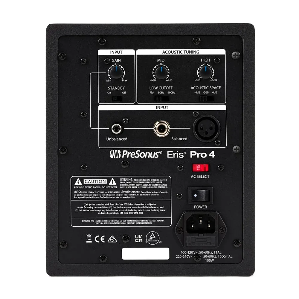 Акустика полагается на двухполосный усилитель Class AB, обеспечивающий 80 Вт мощности: 45 Вт для низкочастотного драйвера и 35 Вт — для высокочастотного. Модель воспроизводит частоты в диапазоне от 55 до 20 000 Гц, а кроссовер-частота располагается на отметке 3400 Гц. Для подключения Eris Pro 4 предусмотрены балансные входы XLR и TRS, а также небалансный RCA-вход. Мониторы годятся для работы с условиях диджейского сетапа или домашнего кинотеатра.