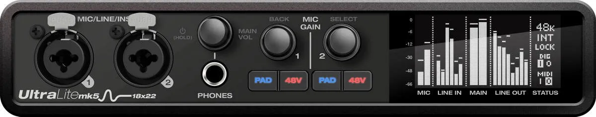 MOTU UltraLite-Mk5 оснащается одними из лучших в своем классе преобразователями. В устройстве применен ЦАП ESS Sabre32 ES9026PRO, динамический диапазон которого составляет 125 дБ, а кг+шум равен -114 дБ. Драйвера для интерфейса были переписаны, благодаря чему производителям удалось добиться рекордных показателей звуковой задержки сигнала (2.4 мс при буфере 32 в режиме 96 кГц).UltraLite-Mk5 может одновременно работать с 40 каналами (18/22), обладает DSP процессором со встроенными эффектами (эквалайзер, ревер, компрессор) и имеет два микрофонных предусилителя с усилением до 75 дБ. Управление большинством настроек звуковой карты возможно из внешнего приложения CueMix, в котором пользователи могут изменять маршрутизацию каналов, уровни громкости, панораму, а также вызывать эффекты.