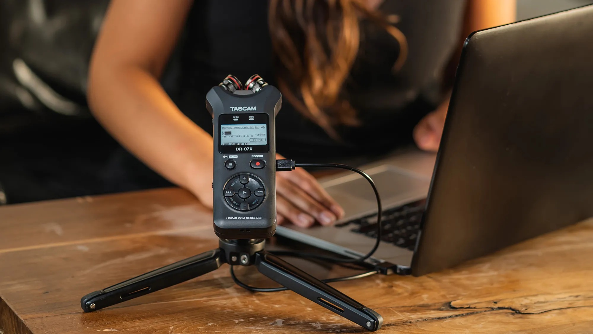 Tascam DR-07X — устройство для внестудийной аудиозаписи. Оснащено аудиоинтерфейсом и конденсаторными микрофонами с настройкой ориентации AB/XY для качественного стереозвука. Работает с microSD до 128 Гб, имеет готовые эффекты, включая реверберацию. Поддерживает Windows и Mac.