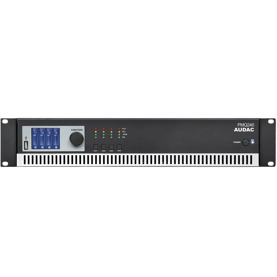 PMQ240 – четырехканальный трансляционный усилитель класса D с современным DSP WaveDynamics™ процессором и 2.5” LCD дисплеем, сочетающий в себе высокое качество, обилие пользовательских настроек и максимально удобный интерфейс управления. Его выходной мощности 4х240 Вт вполне достаточно для озвучивания объектов средних и крупных габаритов, а широкий диапазон частот 50 Гц - 20 кГц позволяет обеспечить весьма достойное качество звучания при использовании качественной акустики.Еще одно важное достоинство данного устройства это возможность деления объекта на 4 зоны объекта с целью трансляции в них информации с различных источников, что особенно актуально при построении СОУЭ да и просто систем озвучивания в зданиях с помещениями различного назначения. Для удобного управления и мониторинга состояния каналов кнопки активации и индикаторы вынесены на лицевую панель устройства. Тут же размещен LCD дисплей, поворотный переключатель просмотра меню и управления настройками усилителя, а также системный USB-порт для загрузки или дублирования файлов конфигурации системы.