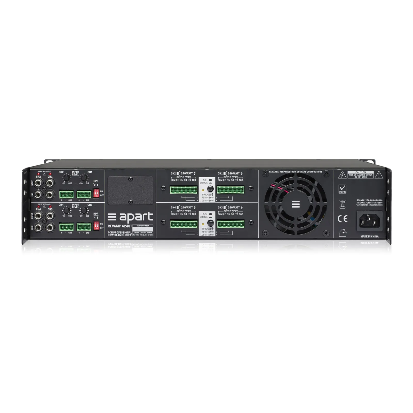 APart REVAMP4240T — это профессиональный 4-канальный цифровой усилитель мощности. Он обеспечивает выходную мощность 4 х 240 Вт при нагрузке 100 вольт (или 4 Ом) и 2 х 480 Вт в мостовом режиме. Устройство оснащено импульсным блоком питания и выходным каскадом класса D. Оно поддерживает различные конфигурации подключения и имеет интеллектуальное охлаждение.