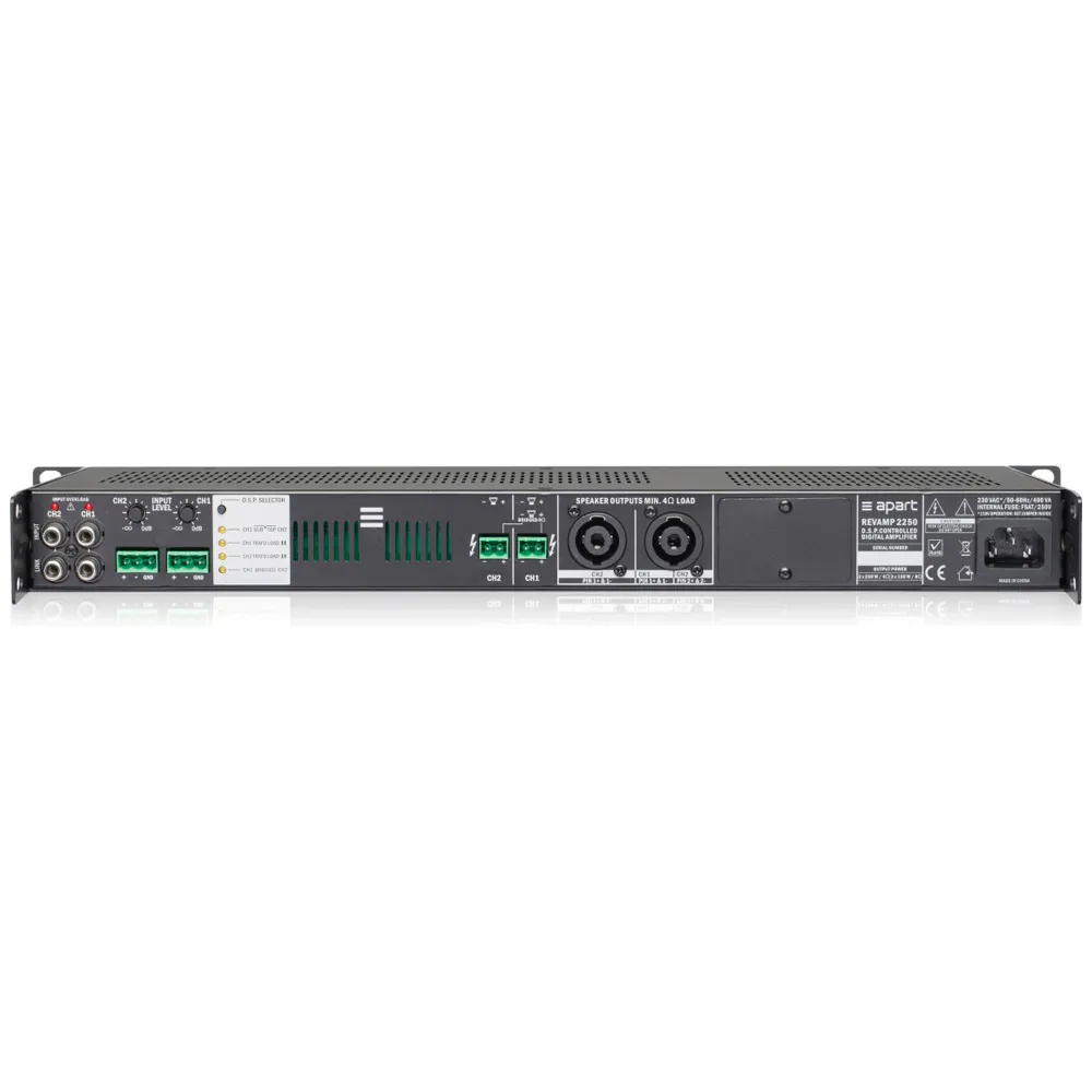 BIAMP APART REVAMP2250 имеет полную защиту схем от замыкания, перегрева и других помех. На передней панели — графический ЖК-дисплей и тумблер питания. На тыловой — входные и выходные разъёмы, регуляторы громкости входного сигнала.